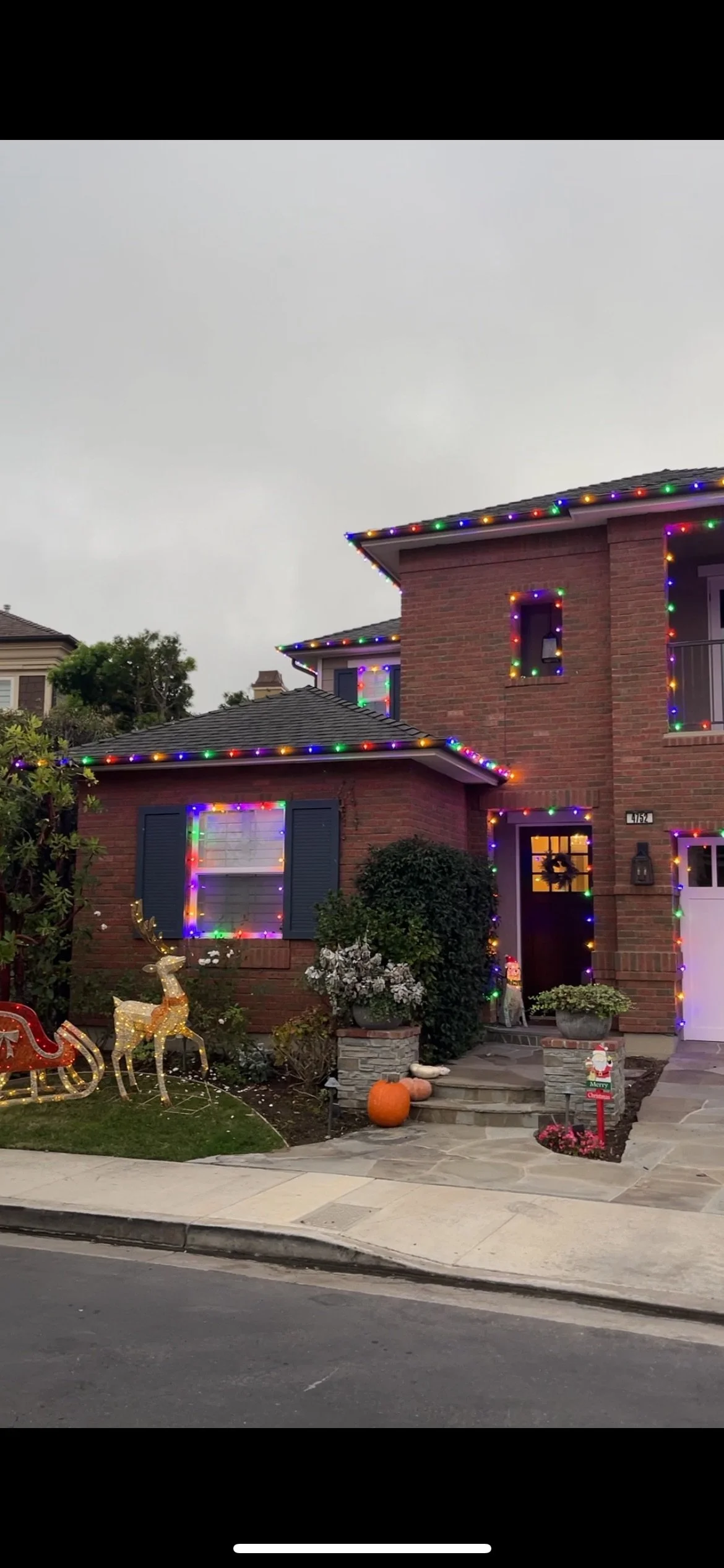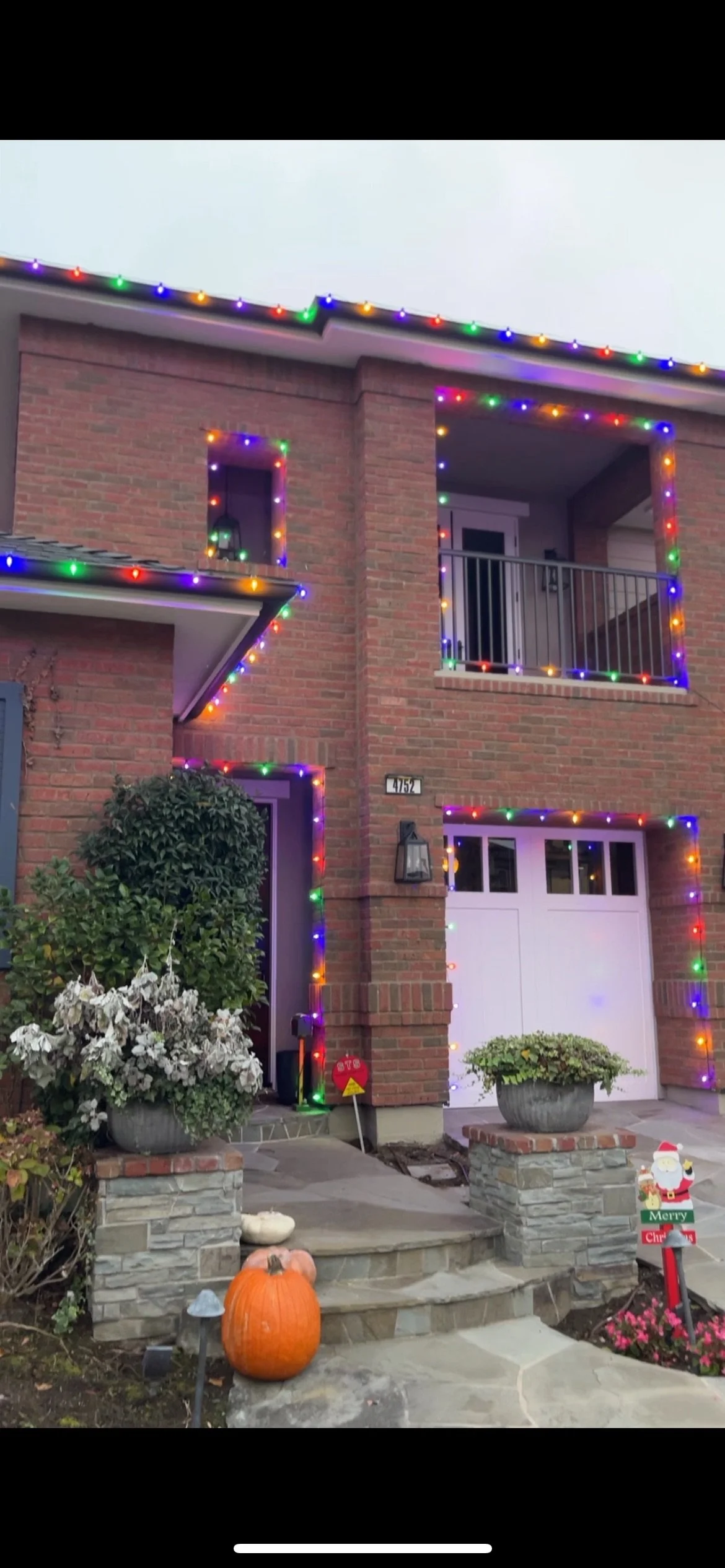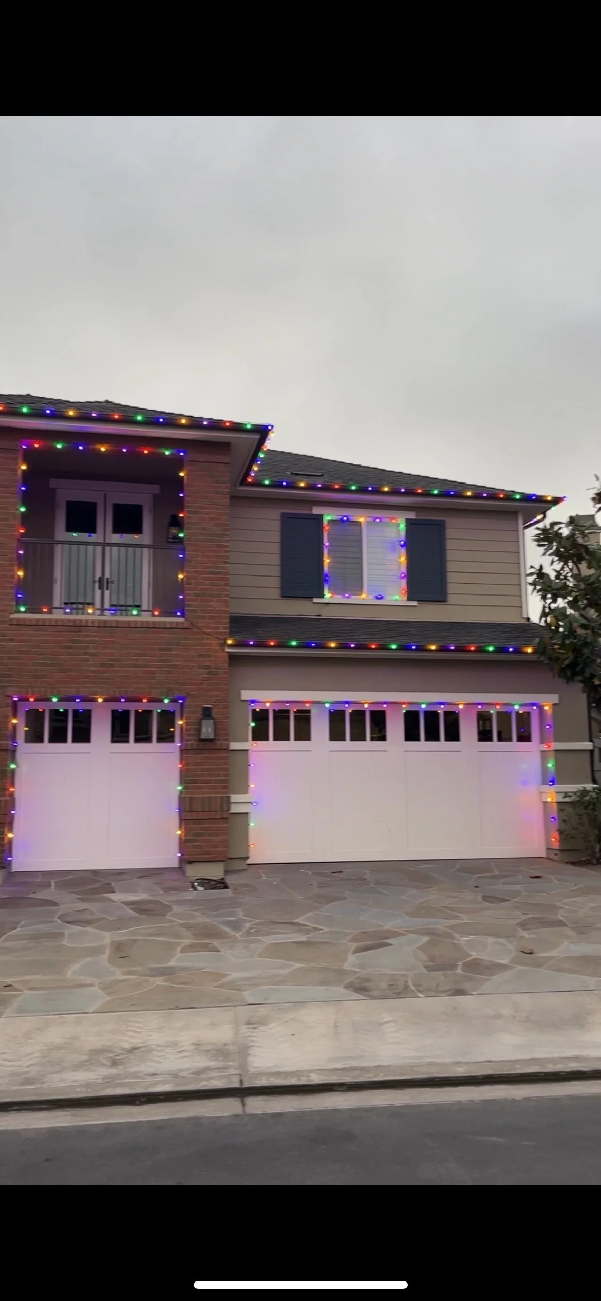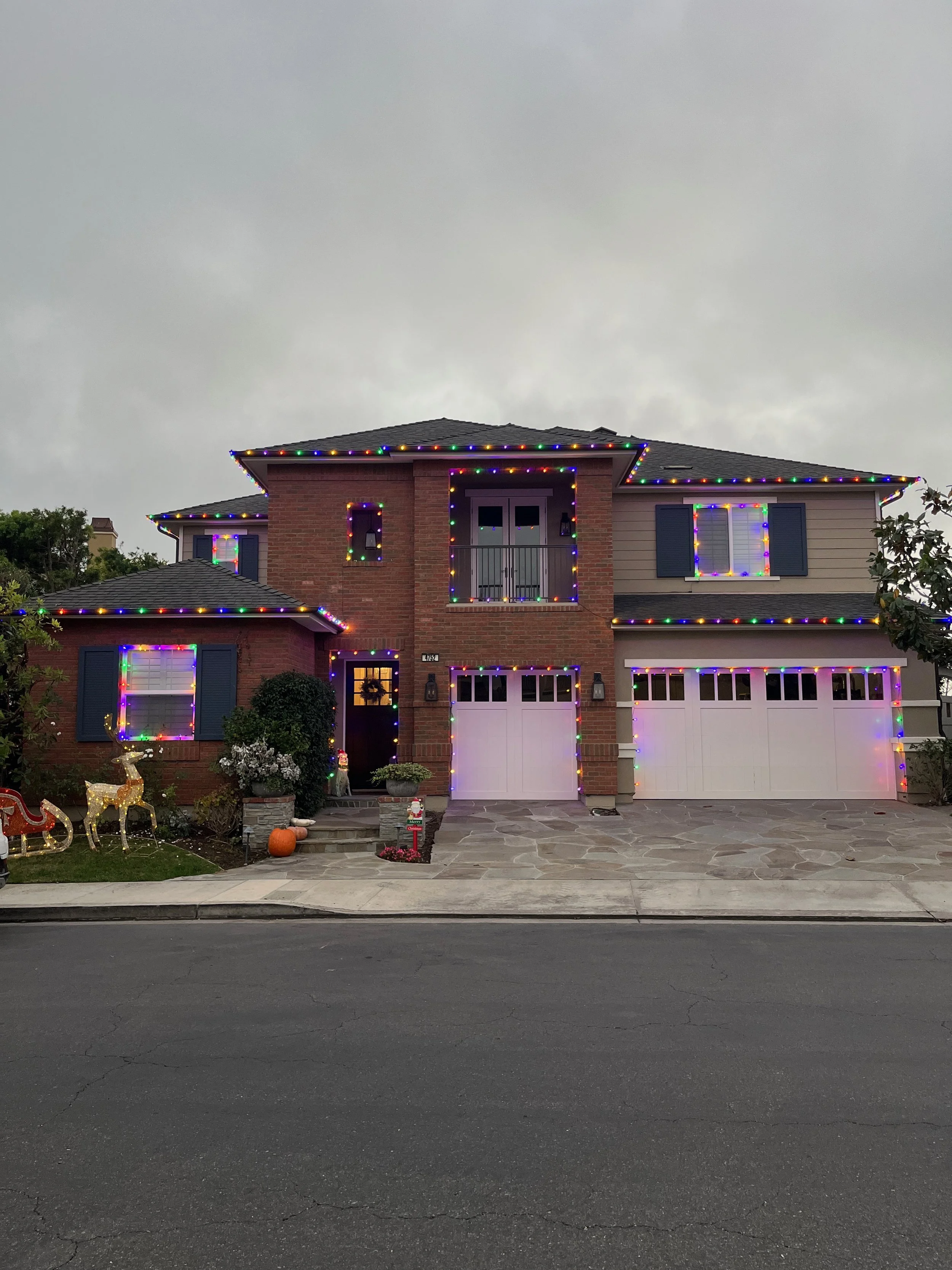 The customer had an existing set of colorful C9 bulbs from a previous installation and requested a clean, sharp roofline layout. We re-installed their lights with improved wire management and consistent bulb orientation across the entire roofline.